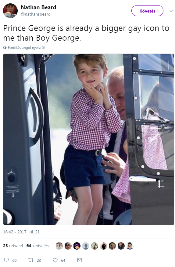 György herceg a hamburgi fotón határtalan lelkesedéssel szemléli a helikoptert, egyes Twitter-felhasználók szerint pedig meleg beütése van a fotón látható reakciónak. Egyikük például azt írta, nagyobb meleg-ikon, mint Boy George.