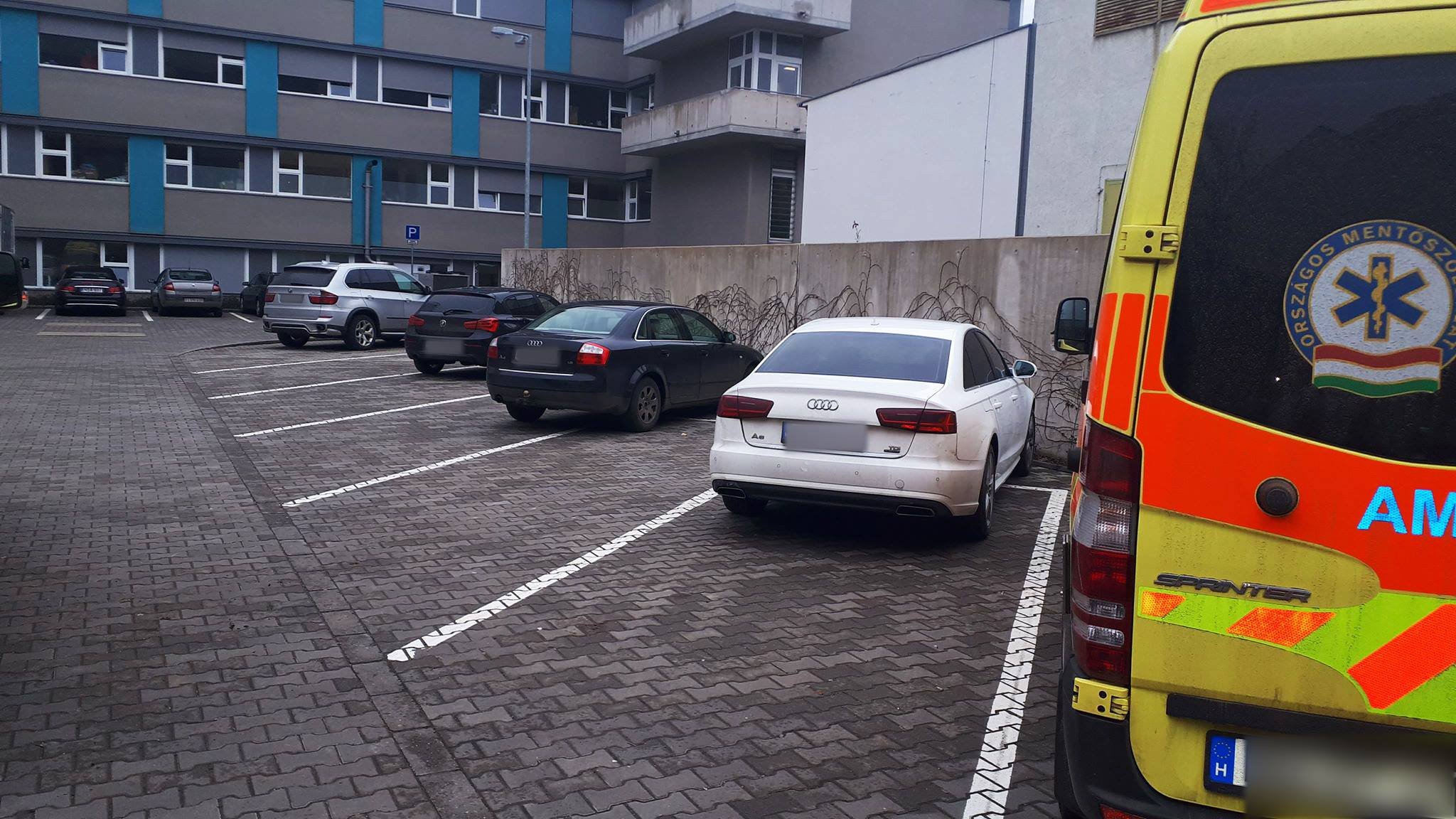 Egy másik képen jól látszik a tábla egyébként, mely jelzi, hogy a parkolóhely a mentősöké: